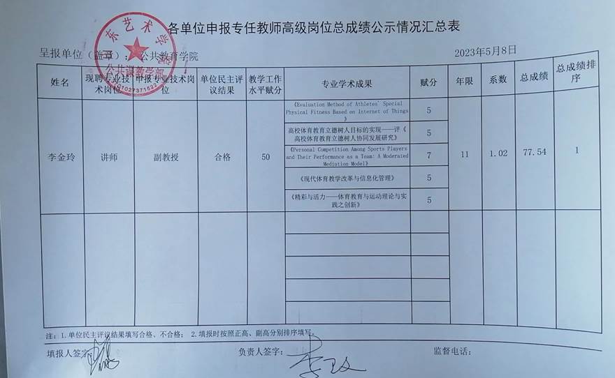 公共教育学院申报专任教师高级岗位总成绩公示情况汇总表
